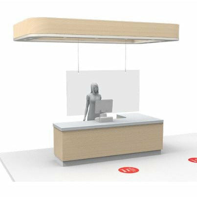 This hanging clear shield acts as a physical barrier and helps maintain social distance. This kit comes with wire and J brackets and is to be hung from the ceiling at a store checkout lane, POS register area or customer service counter. Made from durable acrylic material and covering a large area, this barrier provides solid separation between customers and employees.