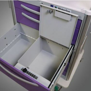 9" Key locking, half drawer security box. Permanently mounted into drawer.
